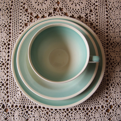 グリーンのティーカップトリオ、ソーサーに少し貫入がありますが、とてもよいコンディションで出番待ちをしております。