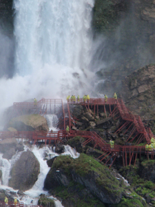 カナダ滝は、滝のすぐ傍からエレベーターと階段を使って下に降りれるようになっていて、滝の端っこの裏に出ることができます(有料)。