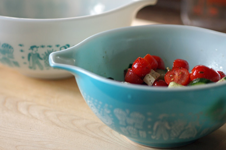 チェリートマトを半分に切り、キュウリを適当にコロコロに切ったものと、そのチーズ&オイルを混ぜ、レモン汁をギュッと絞り、さらにオリーブオイルを足して、挽きたての塩と胡椒で味付け。